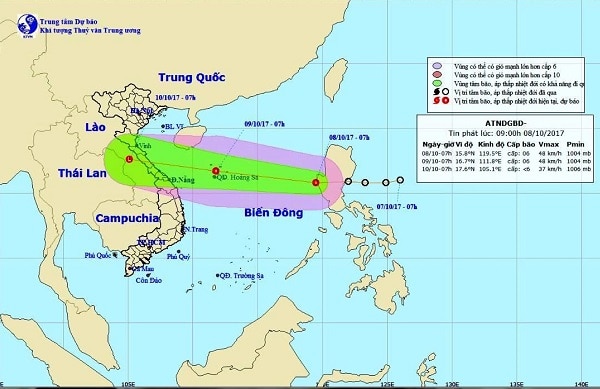 Theo Trung tâm Dự báo Khí tượng Thủy văn Trung ương, vào lúc 7h sáng nay, vị trí tâm áp thấp nhiệt đới ở vào khoảng 15,8 độ Vĩ Bắc; 119,5 độ Kinh Đông, cách quần đảo Hoàng Sa khoảng 800 km về phía Đông Đông Nam. Sức gió mạnh nhất ở vùng gần tâm áp thấp nhiệt đới mạnh cấp 6 (40 – 50 km/giờ), giật cấp 8.