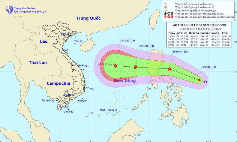 Bản tin do Trung tâm Dự báo Khí tượng Thủy văn Việt Nam phát đi lúc 14h30 cho biết, hồi 13h ngày 19/10, vị trí tâm áp thấp nhiệt đới ở vào khoảng 13,6 độ Vĩ Bắc; 128,4 độ Kinh Đông, cách bờ biển miền Trung Philippines khoảng 440km về phía Đông. Sức gió mạnh nhất vùng gần tâm áp thấp nhiệt đới mạnh cấp 7 (50-60km/giờ), giật cấp 9.