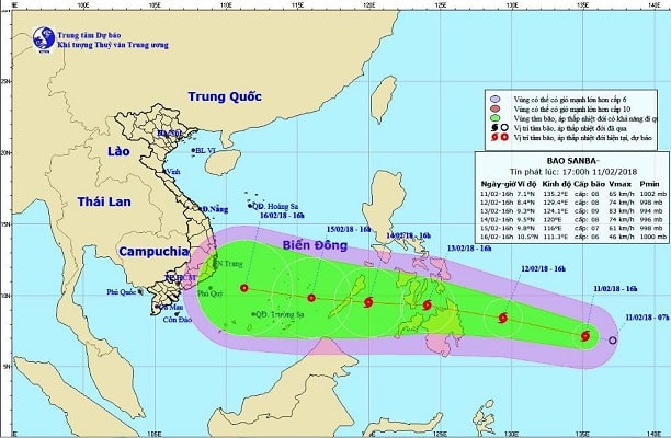 Theo bản tin 17h00 ngày 11/2 của Trung tâm Dự báo Khí tượng Thủy văn Trung ương, chiều 11/2, áp thấp nhiệt đới trên khu vực phía Đông miền Nam Philippines đã mạnh lên thành bão, có tên quốc tế là Sanba.