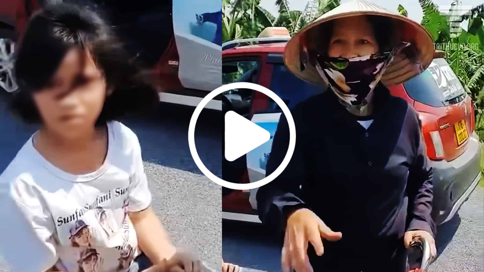Một video ghi cảnh một số người đang khẳng định “đã bắt được kẻ bắt cóc cháu bé”, hỏi han cháu và chất vấn người phụ nữ lạ mặt. Người phụ nữ này ở tuổi trung niên, đạp xe đạp, phía sau chở theo một bé gái.