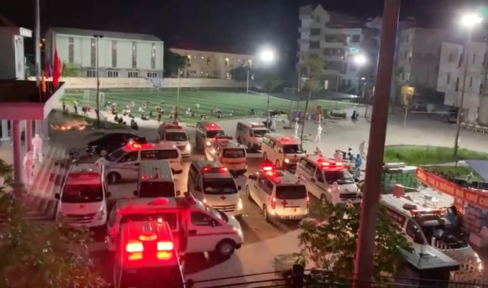 Bắc Giang trong đợt sơ tán khoảng 3.000 công nhân trọ tại thôn Núi Hiểu (xã Quang Châu) vào các khu cách ly tập trung, tối đêm 27/5. (Ảnh chụp màn hình/clip/tuoitre.vn)