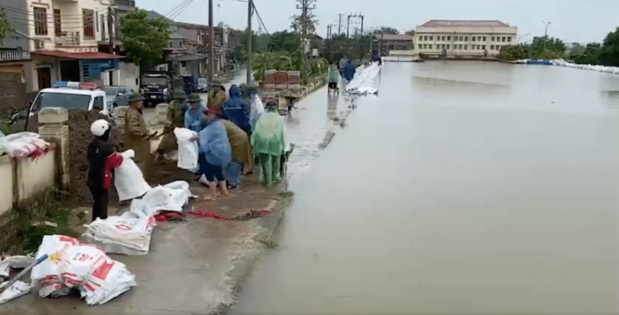 Người dân cùng lực lượng chức năng đang hộ đê. (Ảnh: Chụp màn hình/video/danviet.vn)