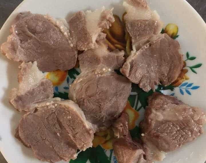 Thịt lợn đã nấu dùng làm thức ăn cho trẻ mầm non tại Trường Mầm non Thanh Khương có nhiều hạch trắng nghi nhiễm sán lợn. Ảnh do phụ huynh học sinh của trường chụp. (Ảnh dẫn qua FB Nguyễn Hoài Thu)