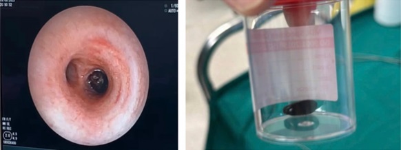 Trẻ được hội chẩn toàn viện thống nhất nội soi hô hấp tại phòng mổ, ghi nhận: phế quản gốc phải có dị vật cứng màu nâu đen, di động lên xuống theo nhịp thở, bít kín lòng phế quản.