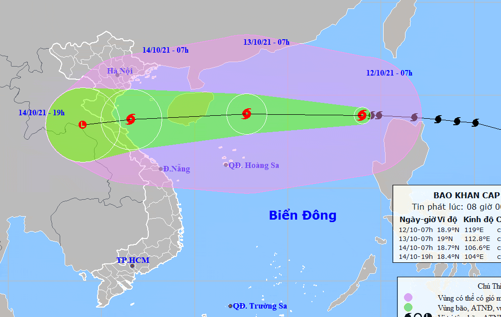 Theo Trung tâm Dự báo khí tượng thủy văn quốc gia, vào 7h sáng ngày 12/10, bão Kompasu đã vượt qua quần đảo Philippines, vào Biển Đông, cách quần đảo Hoàng Sa khoảng 850km về phía Đông Đông Bắc, giật cấp 13, trở thành cơn bão số 8 trong năm 2021 của Việt Nam.