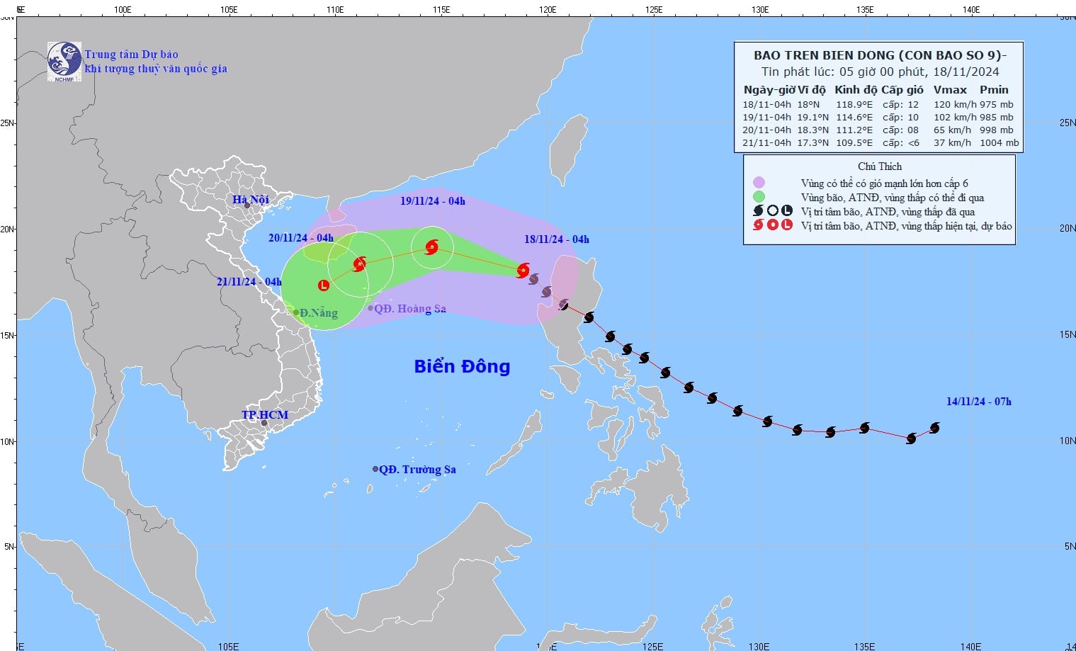 “Khi vào gần bờ biển Trung Trung Bộ của Việt Nam vào ngày 21/11, bão sẽ suy yếu thành một vùng áp thấp, kết hợp với không khí lạnh trước đó sẽ gây mưa lớn ở miền Trung giai đoạn 21-24/11. Bà con từ Huế tới Quảng Ngãi đề phòng ngập lụt cục bộ trong giai đoạn này”, ông Huy nhận định.