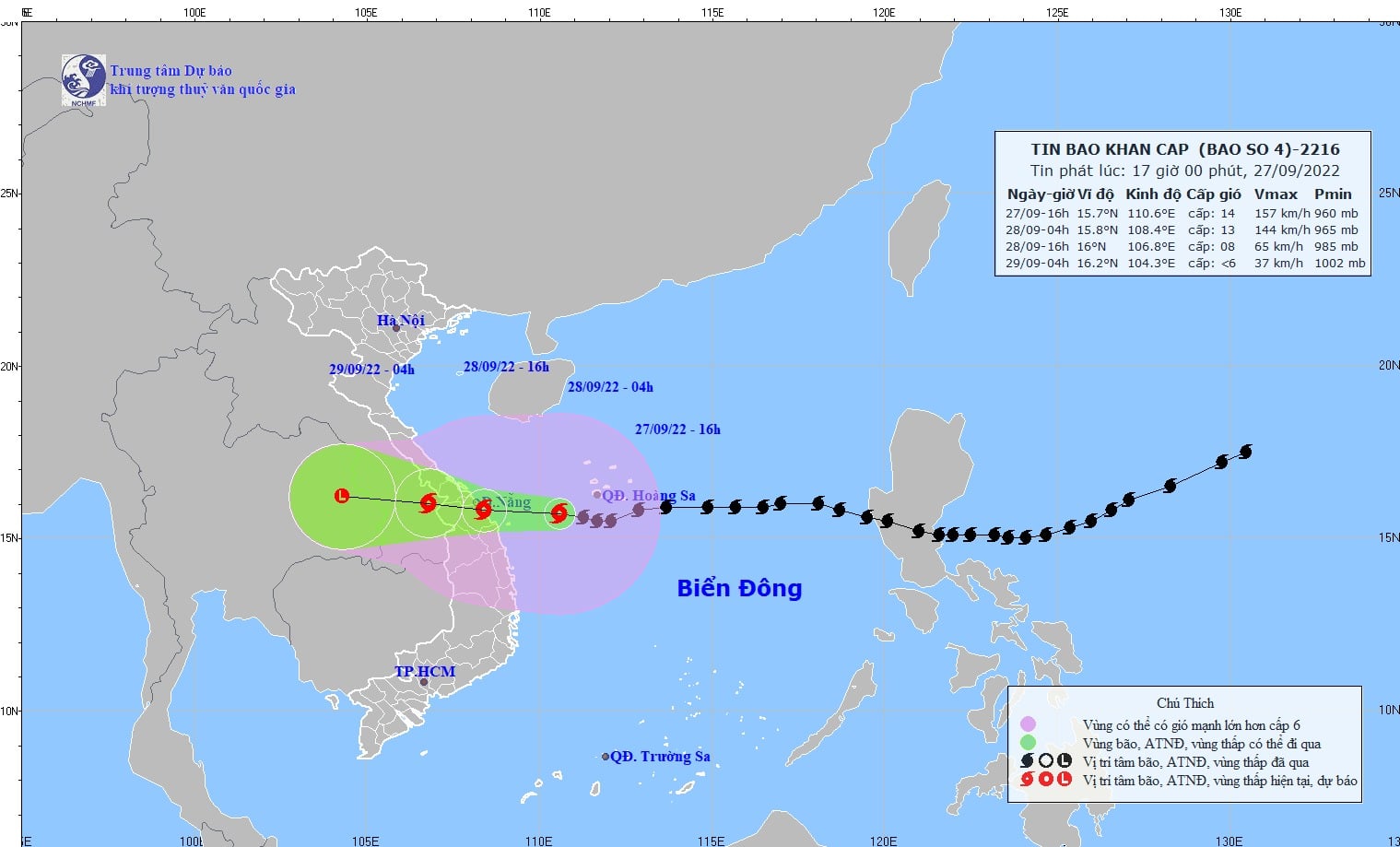 Hồi 16h ngày 27/9, vị trí tâm bão ở khoảng 15,7 độ Vĩ Bắc; 110,6 độ Kinh Đông, cách đất liền khu vực Đà Nẵng-Quảng Ngãi khoảng 210km về phía Đông. Sức gió mạnh nhất vùng gần tâm bão mạnh cấp 14 (150-16km/giờ), giật cấp 17. Bán kính gió mạnh từ cấp 6, giật từ cấp 8 trở lên khoảng 300km tính từ tâm bão; bán kính gió mạnh từ cấp 10, giật từ cấp 12 trở lên khoảng 150km tính từ tâm bão.