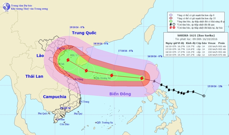 Bão Sarika đã vào Biển Đông, theo hướng bắc Trung bộ và đông Bắc bộ