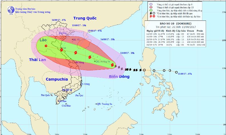 Theo Trung tâm Dự báo Khí tượng Thủy văn Trung ương, hồi 19h ngày 13/9, vị trí tâm bão số 10 ở vào khoảng 15,6 độ Vĩ Bắc; 114,8 độ Kinh Đông, cách quần đảo Hoàng Sa khoảng 290 km về phía Đông Đông Nam. Sức gió mạnh nhất ở vùng gần tâm bão mạnh cấp 9 (75 đến 90 km/giờ), giật cấp 12.