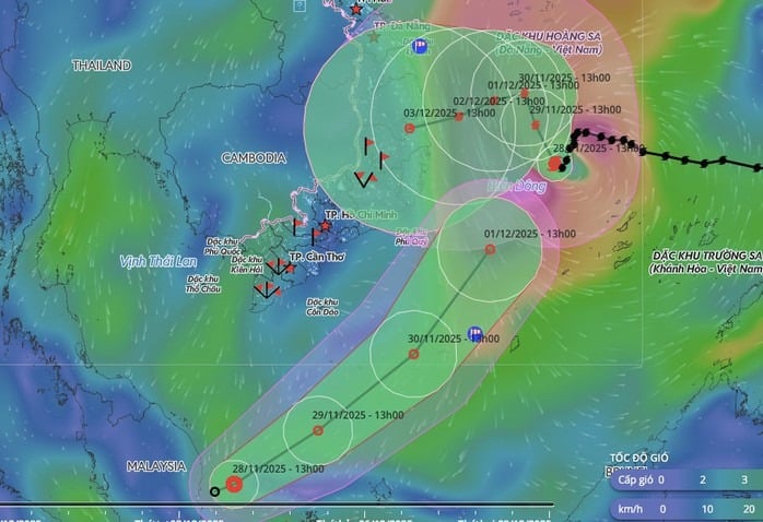 Dự báo đến 13h ngày 29/11, áp thấp nhiệt đới di chuyển Đông Bắc với tốc độ khoảng 15 km/h, vị trí tâm ở 5,50 độ Vĩ Bắc, 106,50 độ Kinh Đông trên vùng biển phía Tây Nam nam Biển Đông. Cường độ đạt cấp 7, giật cấp 9. Vùng nguy hiểm phía Nam vĩ tuyến 7,00 độ Vĩ Bắc, từ kinh tuyến 104,00 độ Kinh Đông đến 108,60 độ Kinh Đông. Cấp độ rủi ro thiên tai cấp 3 áp dụng cho vùng biển phía Tây Nam nam Biển Đông.