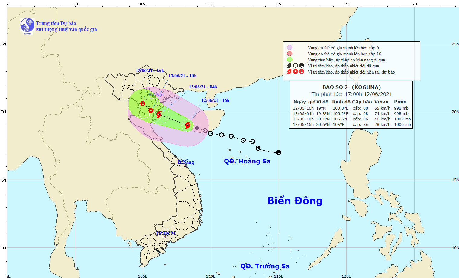 Dự báo trong 12 giờ tới, bão di chuyển theo hướng Tây Tây Bắc, mỗi giờ đi được 15-20km. Đến 04 giờ ngày 13/6, vị trí tâm bão ở khoảng 19,8 độ Vĩ Bắc; 106,2 độ Kinh Đông, ngay trên vùng biển ven bờ từ Hải Phòng đến Nghệ An. Sức gió mạnh nhất vùng gần tâm bão mạnh cấp 8 (60-75km/giờ), giật cấp 10.