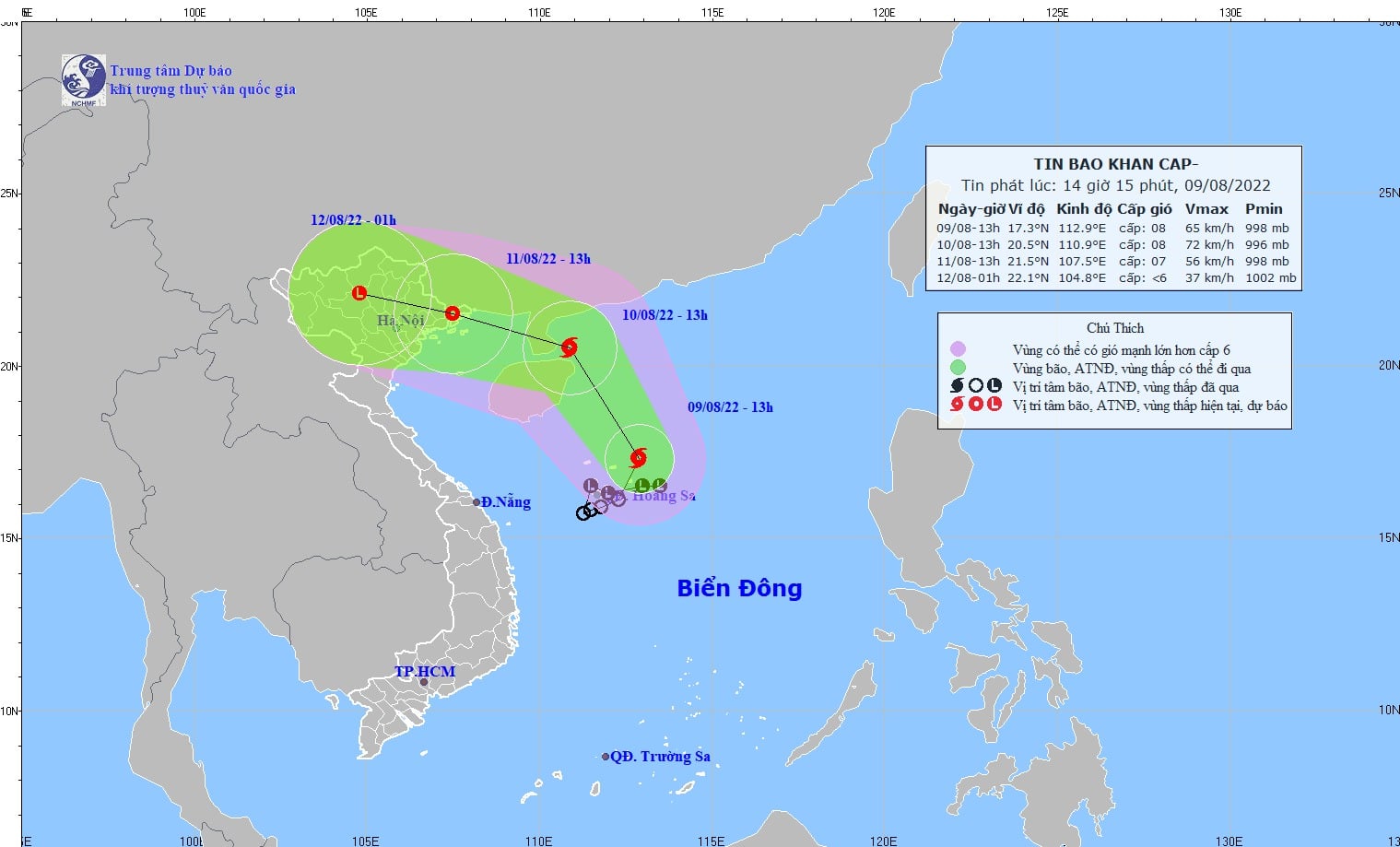 Hồi 13h ngày 9/8, vị trí tâm bão ở vào khoảng 17,3 độ Vĩ Bắc; 112,9 độ Kinh Đông, trên khu vực phía Đông Bắc quần đảo Hoàng Sa; cách đảo Hải Nam (Trung Quốc) khoảng 300km về phía Đông Nam. Sức gió mạnh nhất vùng gần tâm bão mạnh cấp 8 (62-74km/giờ), giật cấp 10. Bán kính gió mạnh cấp 6, giật cấp 8 khoảng 110km tính từ tâm bão.