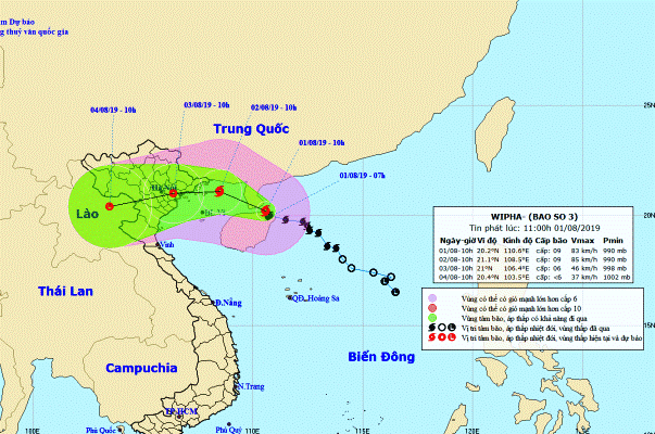 Hồi 10 giờ ngày 1/8, vị trí tâm bão số 3 ở vào khoảng 20,2 độ Vĩ Bắc; 110,6 độ Kinh Đông, cách đất liền các tỉnh Quảng Ninh-Hải Phòng khoảng 360km về phía Đông Đông Nam. Sức gió mạnh nhất vùng gần tâm bão mạnh cấp 9 (75-90km/giờ), giật cấp 12. Bán kính gió mạnh cấp 6, giật cấp 8 trở lên khoảng 170km tính từ tâm bão.
