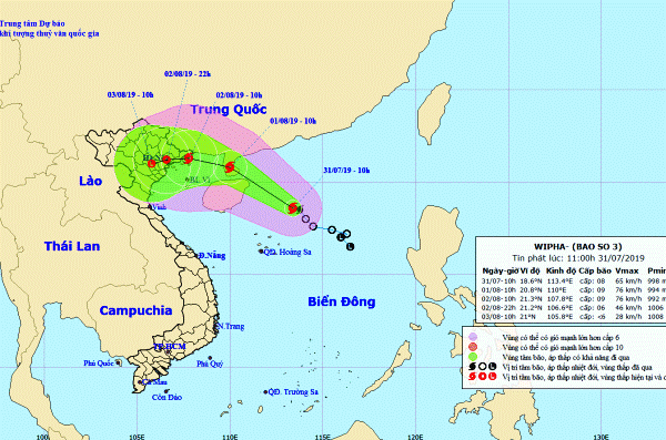 Theo Trung tâm Dự báo Khí tượng Thủy văn Trung ương, hồi 10 giờ ngày 31/7, vị trí tâm bão ở vào khoảng 18,6 độ Vĩ Bắc; 113,4 độ Kinh Đông, cách quần đảo Hoàng Sa khoảng 240km về phía Đông Bắc. Sức gió mạnh nhất vùng gần tâm bão mạnh cấp 8 (60-75km/giờ), giật cấp 10. Bán kính gió mạnh cấp 6, giật cấp 8 trở lên khoảng 120km tính từ tâm bão.