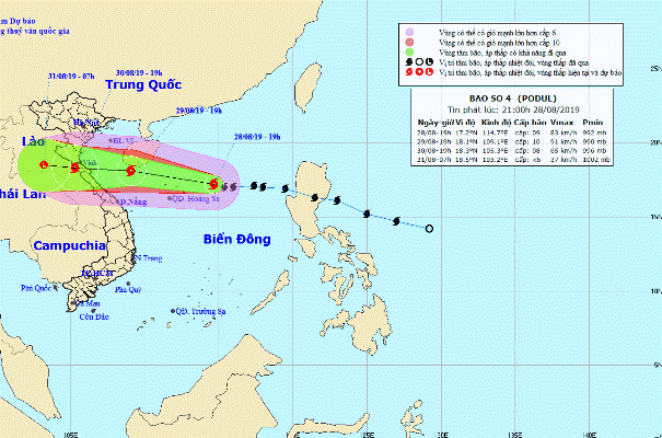 | Theo Trung tâm Dự báo Khí tượng Thủy văn Quốc gia, hồi 19h ngày 28/8, vị trí tâm bão ở vào khoảng 17,2 độ Vĩ Bắc; 114,7 độ Kinh Đông, cách quần đảo Hoàng Sa khoảng 240km về phía Đông. Sức gió mạnh nhất vùng gần tâm bão mạnh cấp 9 (75-90km/giờ), giật cấp 11. Bán kính gió mạnh cấp 6, giật cấp 8 trở lên khoảng 120km tính từ tâm bão. Dự báo trong 24 giờ tới, bão di chuyển theo hướng Tây Tây Bắc, mỗi giờ đi được khoảng 25km và có khả năng mạnh thêm. Đến 19 giờ ngày 29/8, vị trí tâm bão ở khoảng 18,1 độ Vĩ Bắc; 109,1 độ Kinh Đông, trên khu vực phía Nam đảo Hải Nam, cách đất liền các tỉnh Nghệ An-Quảng Bình khoảng 290km về phía Đông. Sức gió mạnh nhất vùng gần tâm bão mạnh cấp 9-10 (75-100km/giờ), giật cấp 12. Vùng nguy hiểm trên Biển Đông trong 24h tới (gió mạnh cấp 6, giật cấp 8 trở lên): Phía Bắc vĩ tuyến 15,0 độ Vĩ Bắc. Trong 24 đến 48h tiếp theo, bão di chuyển chủ yếu theo hướng Tây Tây Bắc, mỗi giờ đi được khoảng 15-20km và có khả năng mạnh thêm, như vậy khoảng chiều và tối ngày 30/8 sẽ đi vào đất liền các tỉnh từ Thanh Hóa đến Quảng Bình với sức gió mạnh cấp 8-9, giật cấp 11. Đến 19h ngày 30/8, vị trí tâm bão ở khoảng 18,3 độ Vĩ Bắc; 105,3 độ Kinh Đông, trên đất liền các tỉnh Trung Bộ. Sức gió mạnh nhất vùng gần tâm bão mạnh cấp 8 (60-75km/giờ), giật cấp 10. Trong 48 đến 60h tiếp theo, bão di chuyển theo hướng Tây Tây Bắc, mỗi giờ đi được khoảng 20km, tiếp tục đi sâu vào đất liền và suy yếu thành áp thấp nhiệt đới, sau đó suy yếu thành một vùng áp thấp trên khu vực Thượng Lào. Sức gió mạnh nhất ở trung tâm vùng áp thấp giảm xuống dưới cấp 6 (dưới 40km/giờ). |
