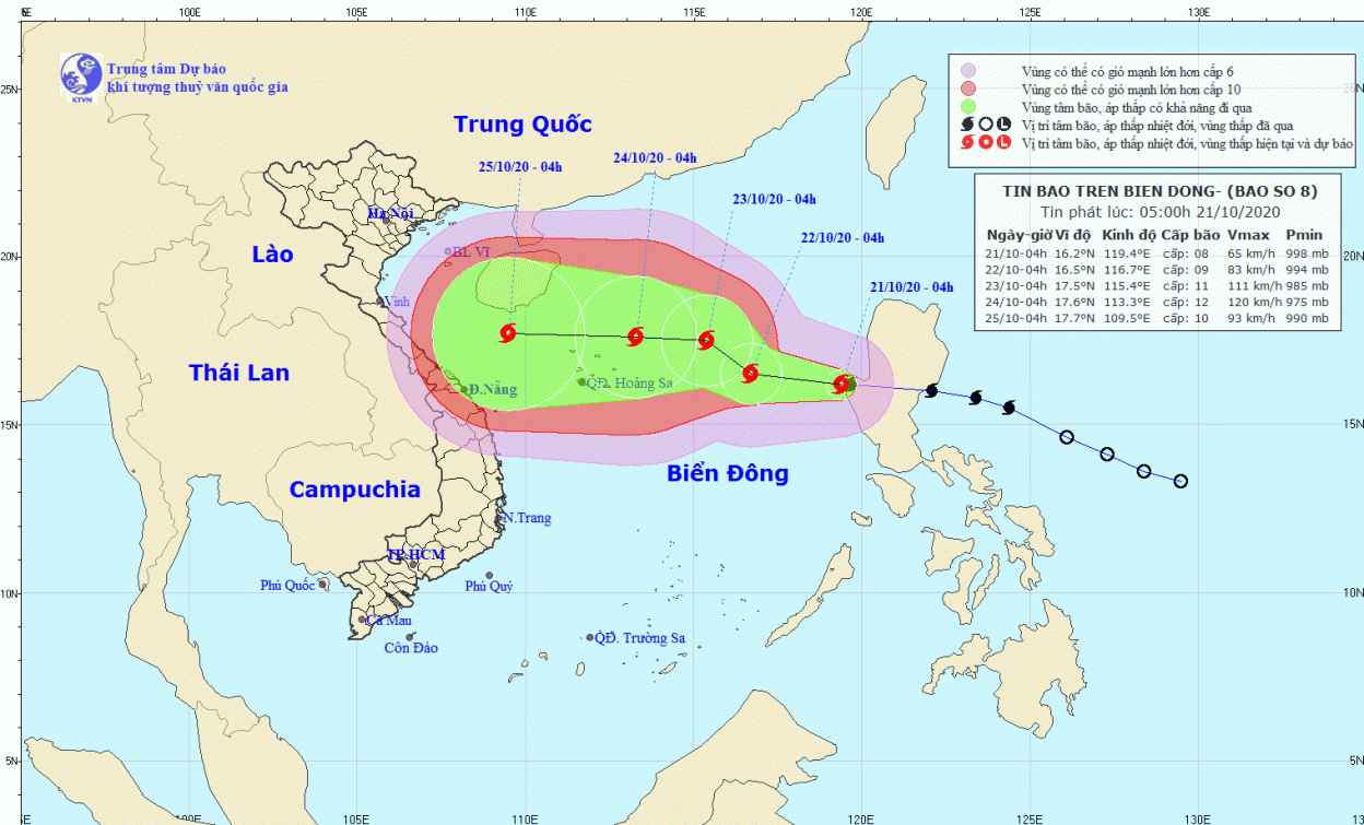 Theo Trung tâm dự báo khí tượng thủy văn quốc gia, vào 4h sáng nay (21/10), vị trí tâm bão ở cách quần đảo Hoàng Sa khoảng 770km về phía Đông Đông Nam. Sức gió mạnh nhất vùng gần tâm bão mạnh cấp 8 (60-75km/giờ), giật cấp 10.