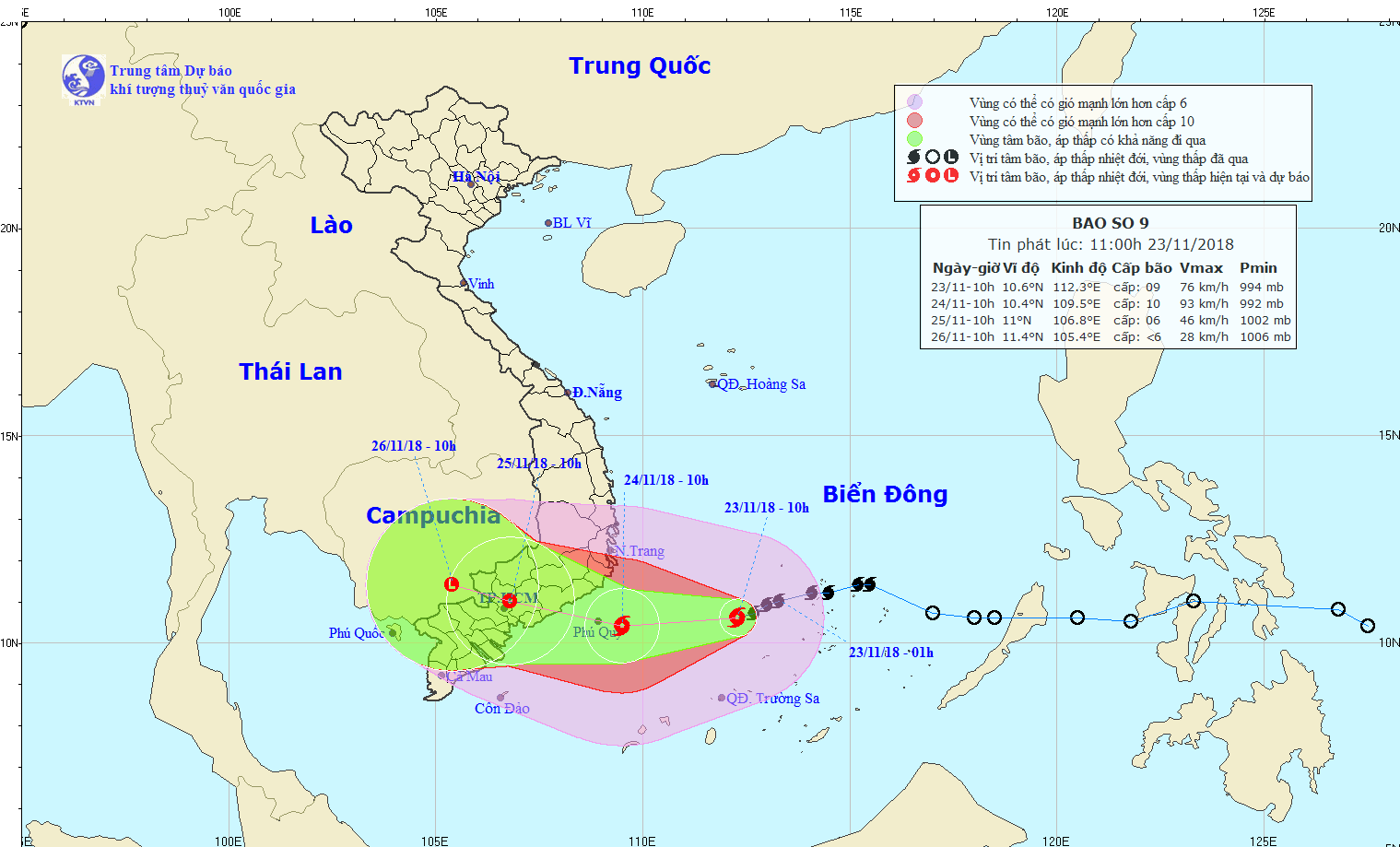 Theo Trung tâm Dự báo Khí tượng Thủy văn Trung ương, hồi 10h ngày 23/11, vị trí tâm bão ở vào khoảng 10,6 độ Vĩ Bắc; 112,3 độ Kinh Đông, cách đảo Phú Quý khoảng 360km, cách Phan Rang (Ninh Thuận) khoảng 370km, cách Vũng Tàu (Bà Rịa-Vũng Tàu) khoảng 560km. Sức gió mạnh nhất vùng gần tâm bão mạnh cấp 9 (75-90km/giờ), giật cấp 11. Bán kính gió mạnh cấp 6, giật cấp 8 khoảng 180km tính từ tâm bão.