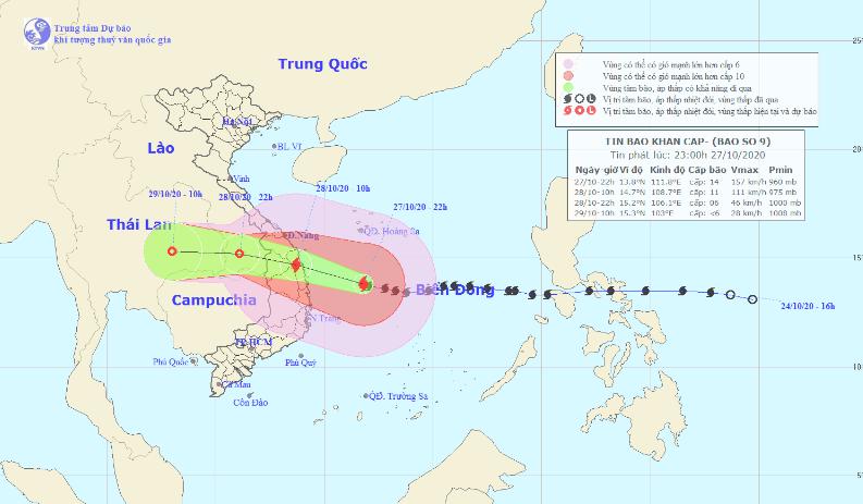 Theo bản tin phát đi từ Trung tâm Dự báo Khí tượng Thủy văn Việt Nam, hồi 22h hôm 27/10, vị trí tâm bão ở khoảng 13,8 độ Vĩ Bắc; 111,8 độ Kinh Đông, cách Đà Nẵng khoảng 460km, cách Quảng Nam 400 km, cách Quảng Ngãi 360 km, cách Phú Yên 280 km. Sức gió mạnh nhất vùng gần tâm bão mạnh cấp 14 (150-165km/giờ), giật cấp 17. Bán kính gió mạnh từ cấp 6, giật từ cấp 8 trở lên khoảng 320km tính từ tâm bão; bán kính gió mạnh từ cấp 10, giật từ cấp 12 trở lên khoảng 160km tính từ tâm bão.
