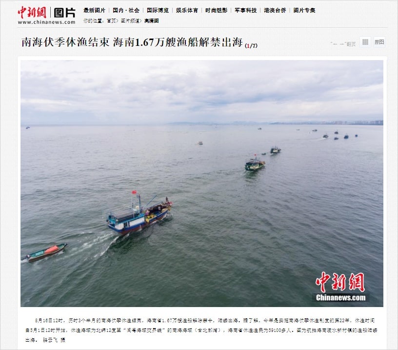 Trang này cho hay trong ngày 16/8, hơn 16.700 tàu cá của tỉnh Hải Nam và 1.300 tàu cá của TP Dương Giang, tỉnh Quảng Đông bắt đầu ra khơi ở khu vực Biển Đông (bao gồm cả Vịnh Bắc Bộ) từ 12 độ vĩ Bắc đến “đường giao nhau của biển Phúc Kiến và Quảng Đông”. Bản tin nói rõ năm nay là năm thứ 22 Trung Quốc thực hiện lệnh cấm đánh bắt cá tại khu vực này, bắt đầu từ 12h ngày 1/5.