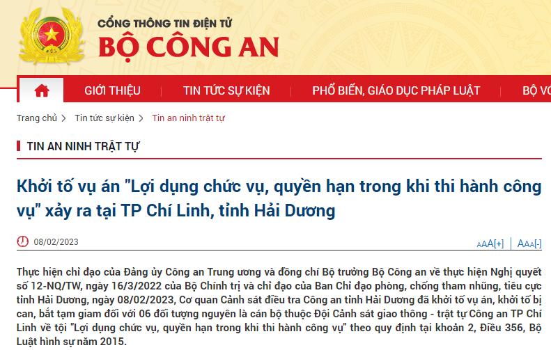 Bộ Công an cho biết ngày 8/2 Cơ quan CSĐT Công an tỉnh Hải Dương khởi tố vụ án, khởi tố bị can và bắt tạm giam 6 cựu cán bộ thuộc Đội Cảnh sát giao thông – Trật tự Công an TP. Chí Linh.