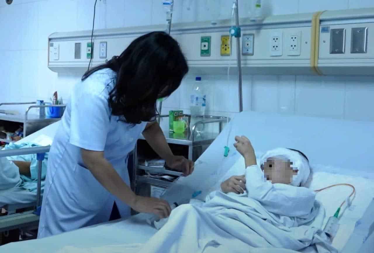 Trước đó, bệnh nhi được cấp cứu đưa vào bệnh viện huyện, sau đó lên bệnh viện tỉnh Lào Cai và theo dõi chấn thương bụng, gan, có chấn thương thận, tuyến thượng thận, gãy chân. Vết thương hở sọ là nặng nhất, nguy cơ nhiễm trùng vi khuẩn yếm khí có thể nguy hiểm tính mạng.