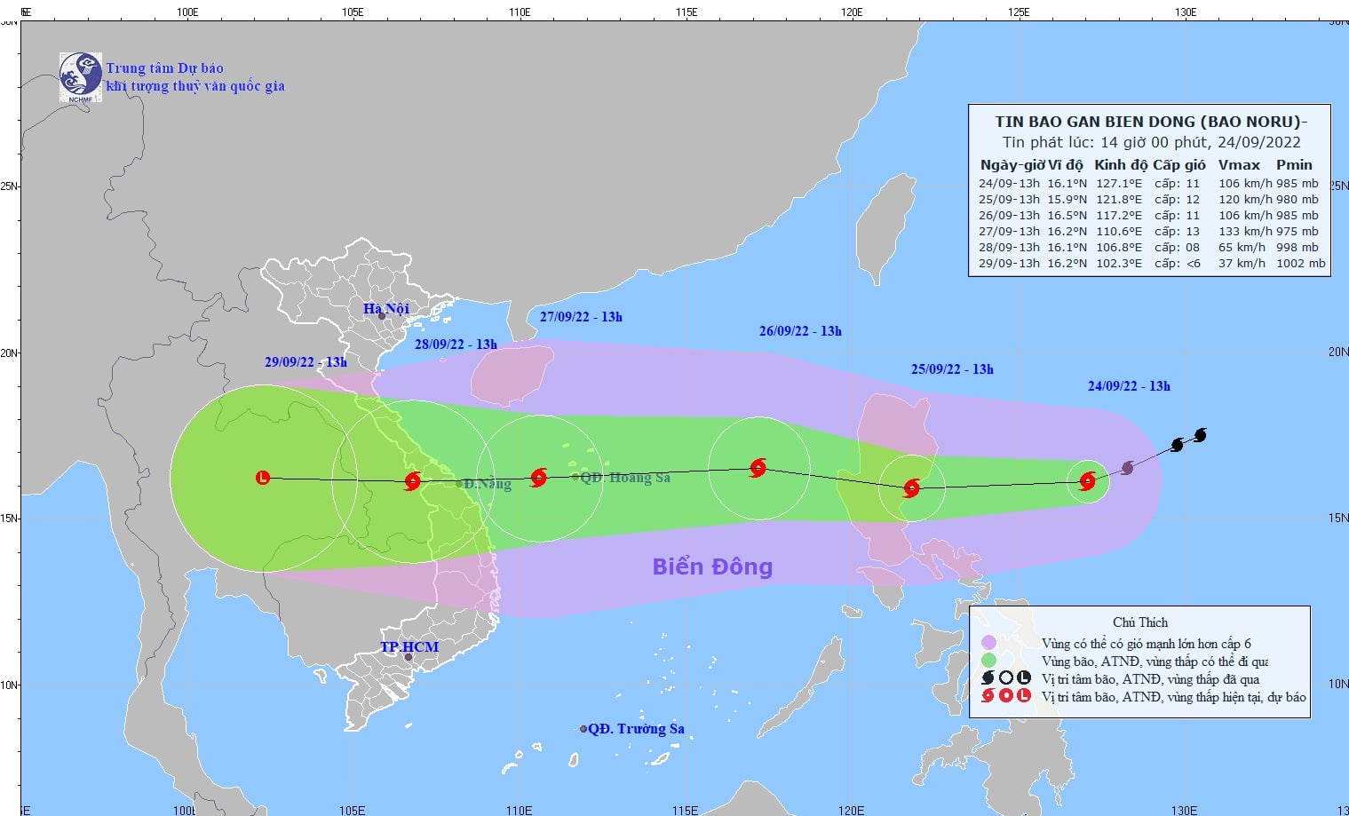 Trong 48 đến 72 giờ tiếp theo, bão di chuyển nhanh theo hướng Tây, mỗi giờ đi được khoảng 30km, có xu hướng mạnh thêm. Đến 13h ngày 27/9, vị trí tâm bão ở khoảng 16,2 độ Vĩ Bắc; 110,6 độ Kinh Đông, cách Thừa Thiên Huế-Quảng Nam khoảng 220km về phía Đông. Sức gió mạnh nhất vùng gần tâm bão mạnh cấp 12-13 (118-149km/giờ), giật cấp 16.