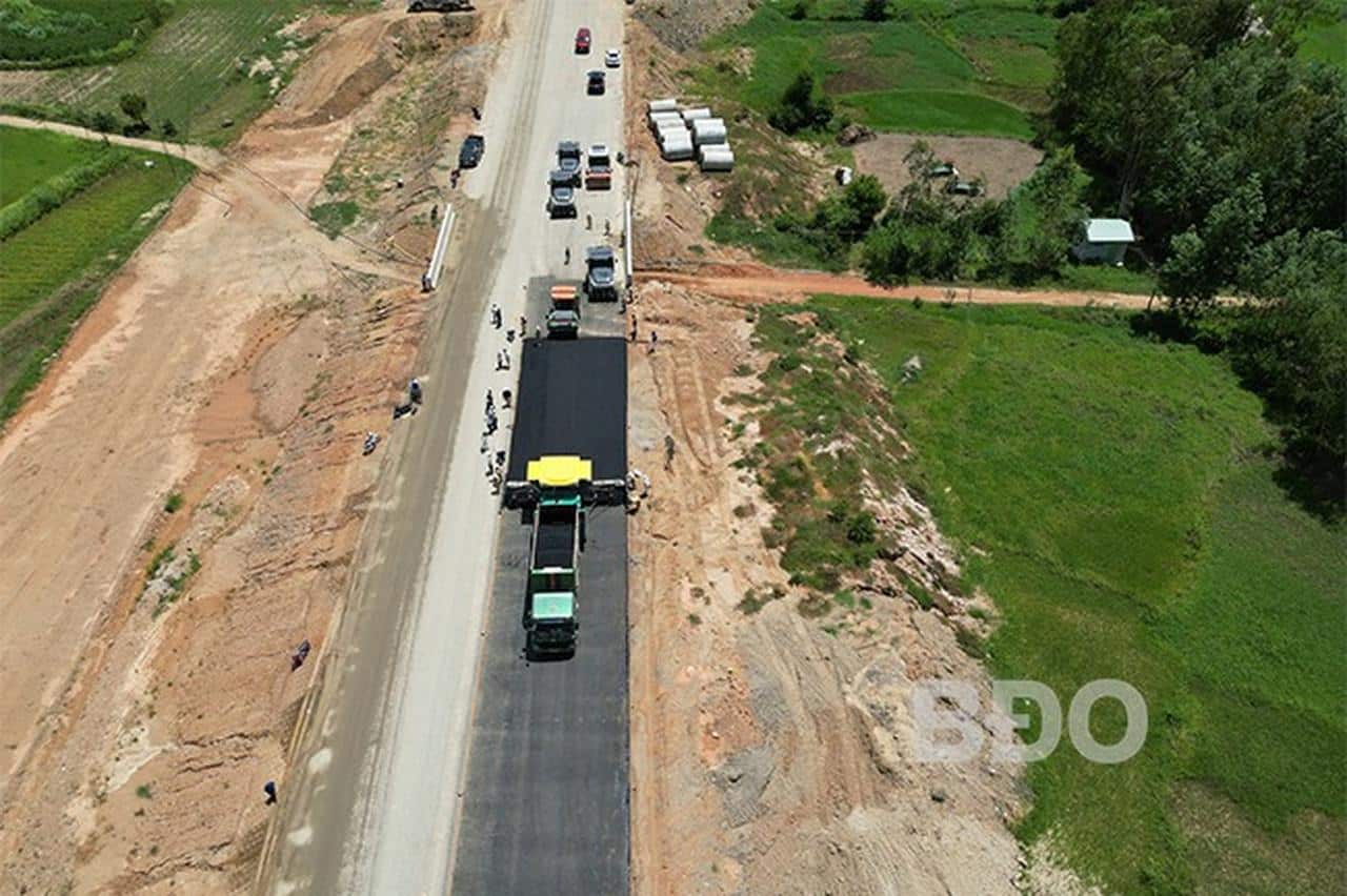 Thi công thảm nhựa tại gói thầu XL12 cao tốc Bắc - Nam, Dự án thành phần Hoài Nhơn - Quy Nhơn. (Ảnh: baobinhdinh.vn)