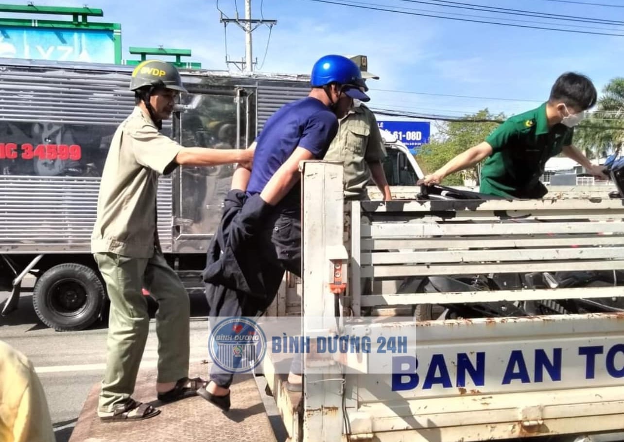 Nam thanh niên Q. bị áp giải, đưa về công an phường. (Ảnh: Người dân ghi lại/Tin Bình Dương 24H/Facebook)