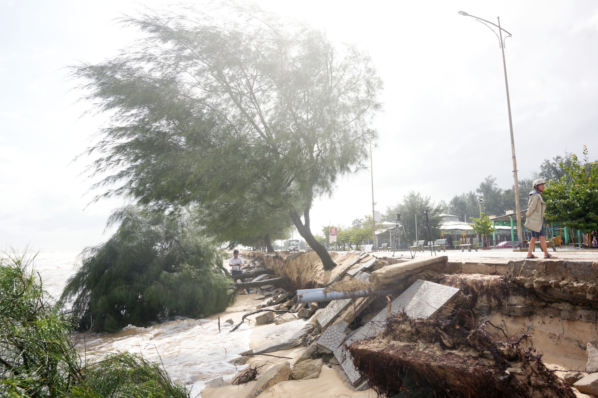Đoạn bị sạt lở nặng nằm giáp ranh giữa xã Phú Thuận và phường Thuận An khiến vỉa hè đường bị phá hỏng, đổ cây ven đường khu vực bãi tắm.