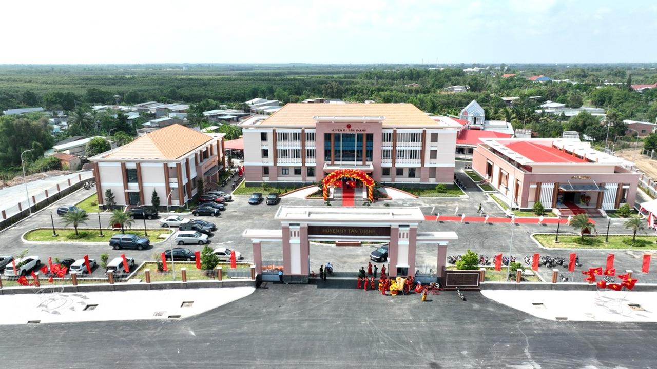 Trụ sở Huyện ủy Tân Thạnh (khu phố 5, Thị trấn Tân Thạnh, tỉnh Long An) được khởi công vào ngày 07/11/2021, khánh thành tháng 5/2023, tổng diện tích trên 10.000m2, tổng mức đầu tư trên 99 tỷ đồng. (Ảnh: la34.com.vn)