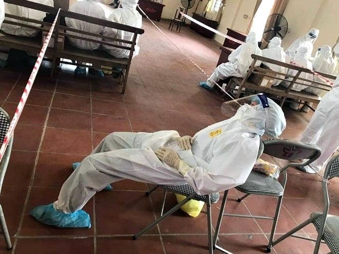 Một nhân viên y tế kiệt sức dưới thời tiết nắng nóng trong đợt lấy mẫu xét nghiệm COVID1-19 diện rộng tại Bắc Giang. (Ảnh: Facebook)