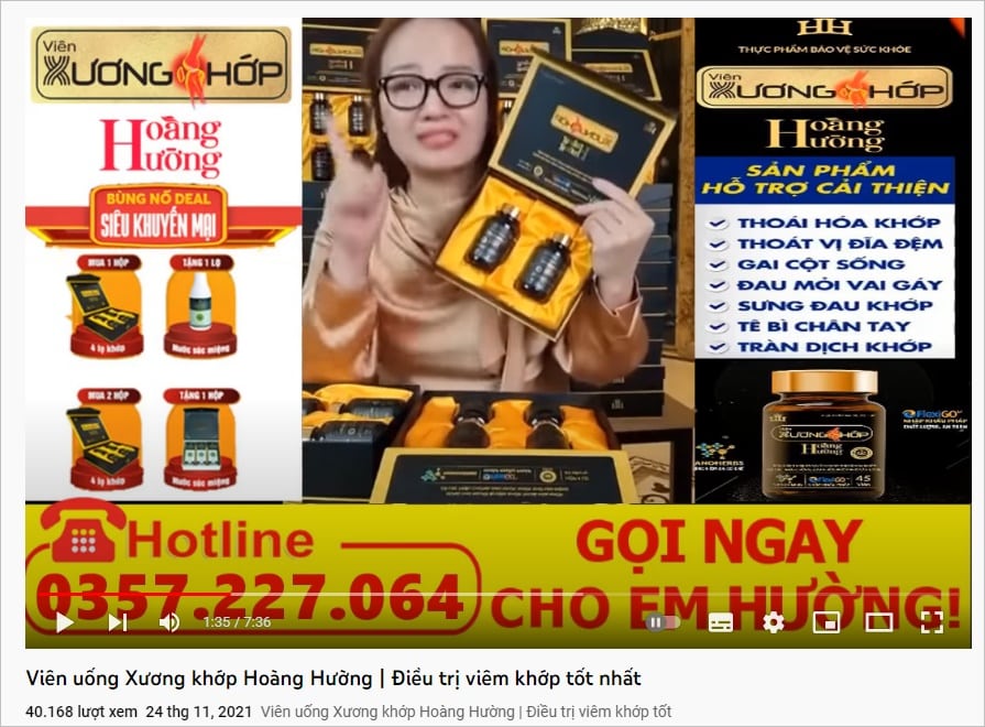 Trong một buổi livestream bán sản phẩm Viên xương khớp Hoàng Hường, đăng lên Youtube ngày 24/11/2021, bà Hoàng Hường – Chủ tịch công ty giới thiệu: “Tất cả những gì liên quan đến khớp, đau xương và khớp thì chắc chắn mọi người sẽ có hiệu quả… Em sẽ không phải người nói hay mà em sẽ làm hay. Ví dụ như sản phẩm Viên xương khớp, em đầu tư 100 tỷ cho việc sở hữu công thức, dám bỏ ra 100 tỷ để có công thức này thì sản phẩm phải rất là ok”.