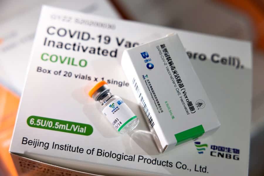 Một lọ vắc-xin Vero Cell (Sinopharm) và thông tin hoạt chất/nồng độ, nhà sản xuất trên vỏ hộp. (Ảnh minh họa: Tawat/Shutterstock)