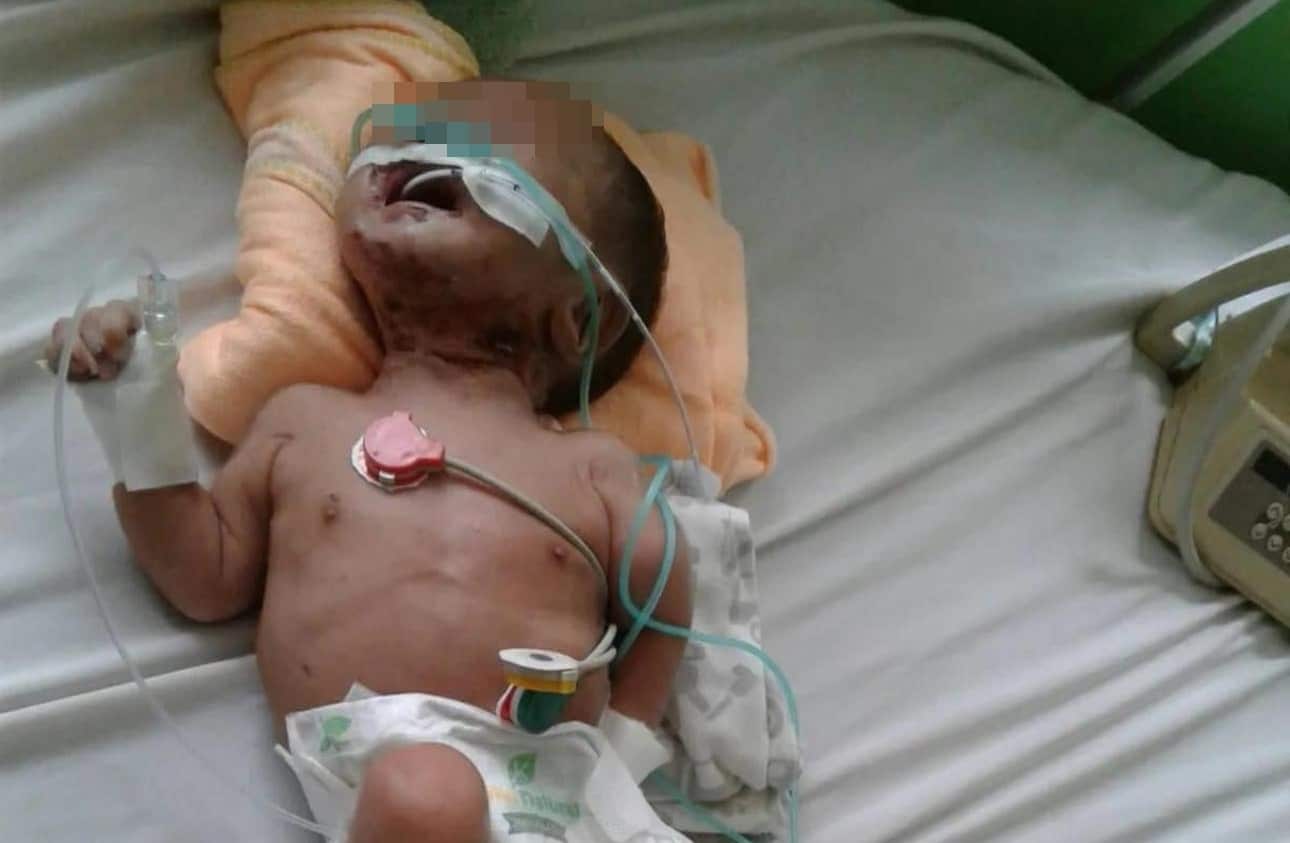 Tại khoa cấp cứu, cháu bé có biểu hiện lừ đừ, tiếp xúc chậm, co gồng tay chân. Tổng trạng suy kiệt. Môi hồng, chi ấm, mạch rõ. Thở co lõm ngực. Vết loét da vùng cổ, bong vảy, không chảy máu. Nhiều vết trầy xước da mặt, cổ, tay 2 bên. Biến dạng cánh tay trái. Gãy hở xương trái đang nẹp cố định.