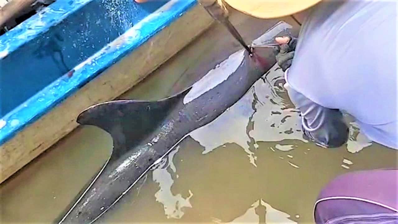 Cá heo lạc vào sông ở Cà Mau chết với vết đâm trên thân