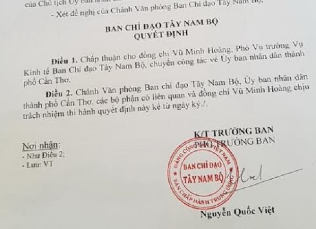 Ban chỉ đạo Tây Nam Bộ ký quyết định chuyển công tác đối với Vũ Minh Hoàng về UBND TP Cần Thơ, sau khi bổ nhiệm làm Phó Vụ trưởng Vụ Kinh tế thuộc ban. (Hình ảnh: nld.com.vn)