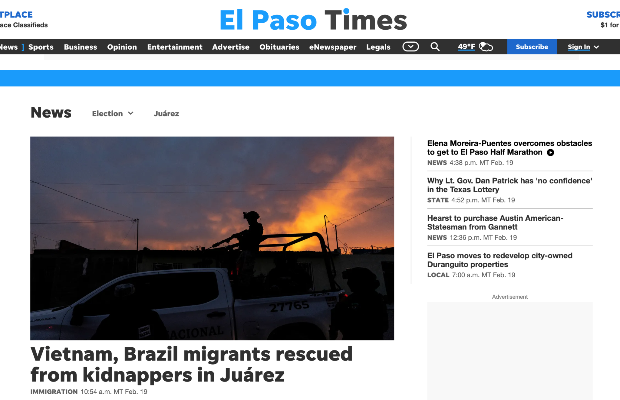 Hai trang này dẫn lời ông Luis Aguirre – Chánh văn phòng Cảnh sát bang Chihuahua nói hôm 17/2 rằng 49 di dân nêu trên bị giam cầm hồi tuần trước trong một căn nhà của một băng nhóm tội phạm. Nhóm này dùng súng khống chế các con tin, đòi phải trả thêm tiền mới được chúng đưa lậu đi tiếp từ Mexico sang Mỹ.