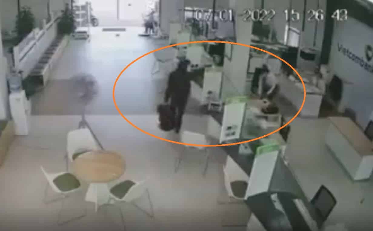 Theo clip trích xuất từ camera an ninh trong ngân hàng, nghi phạm mặc quần áo màu đen, đeo khẩu trang, đội mũ lưỡi trai màu đen đi vào ngân hàng, ngồi xuống ghế trước quầy giao dịch, rồi đứng đậy dùng súng uy hiếp nữ nhân viên tại quầy. Người này yêu cầu các nữ nhân viên gom số tiền tại bàn và các khay tiền phía dưới cho vào balo.