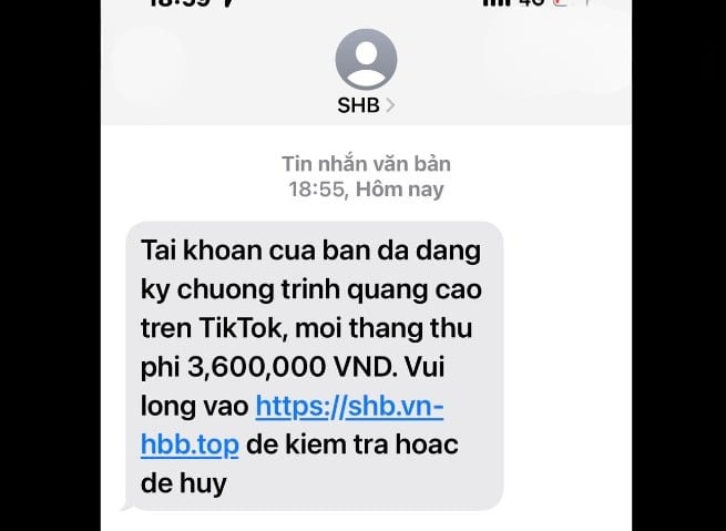 Gần đây, nhiều người chia sẻ màn hình những đoạn tin nhắn (SMS) mạo danh một số ngân hàng như SHB, MSB,… thông báo việc đóng phí quảng cáo trên Tiktok.