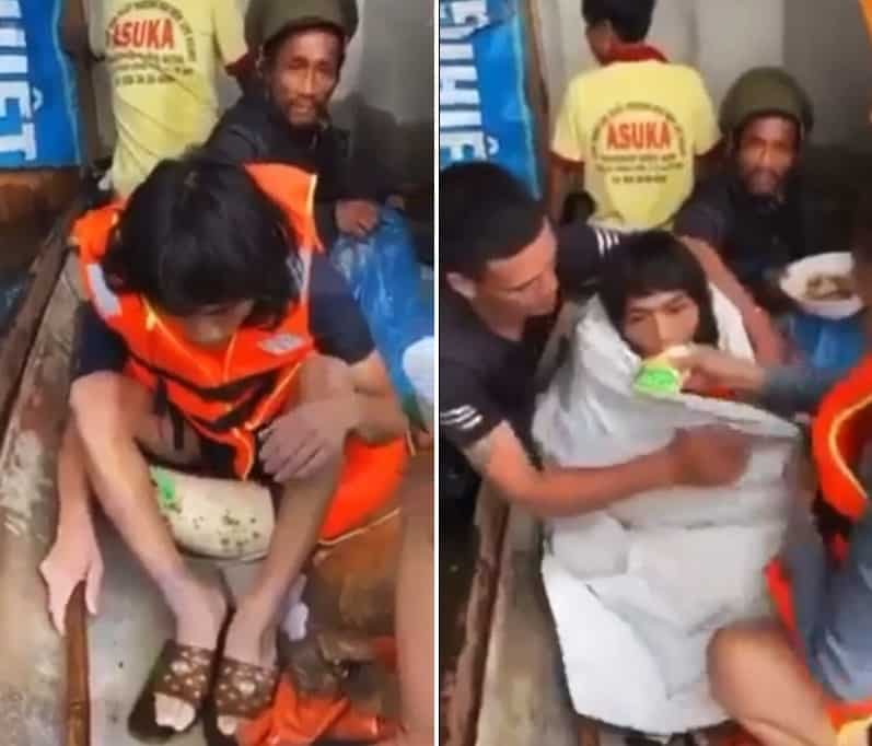 Bàn tay, bàn chân của người này đã trắng lợt, người như không còn sức sống nữa. Khi lên thuyền ngồi run cầm cập. Khi được hỏi mấy ngày này có ăn gì không, người đàn ông trả lời lẩy bẩy: “Dạ, 11 ngày rồi”.