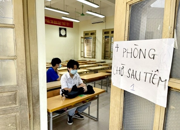 Học sinh lớp 9 tại Hà Đông đang ngồi trong phòng theo dõi sau khi tiêm vắc-xin COVID-19 Pfizer, sáng 27/11/2021. (Ảnh: hadong.hanoi.gov.vn)