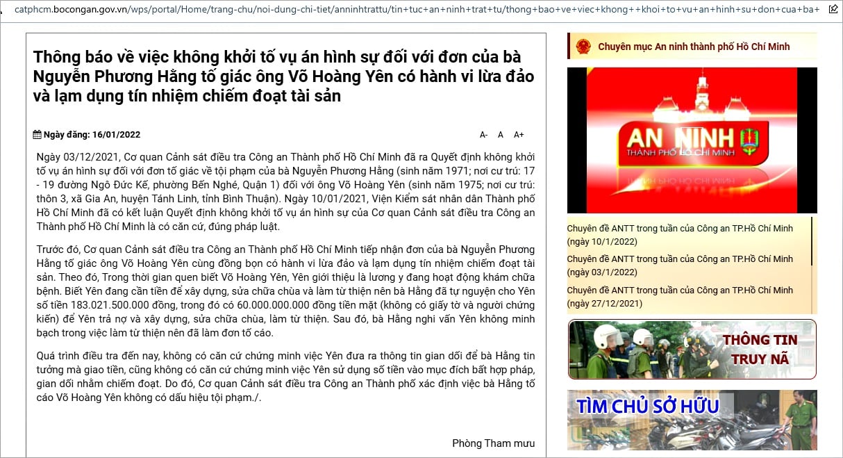 Cổng thông tin điện tử Công an TP.HCM ngày 16/1 đăng thông cáo giải thích về việc không khởi tố vụ án hình sự đối với đơn của bà Hằng tố giác ông Yên nói trên.