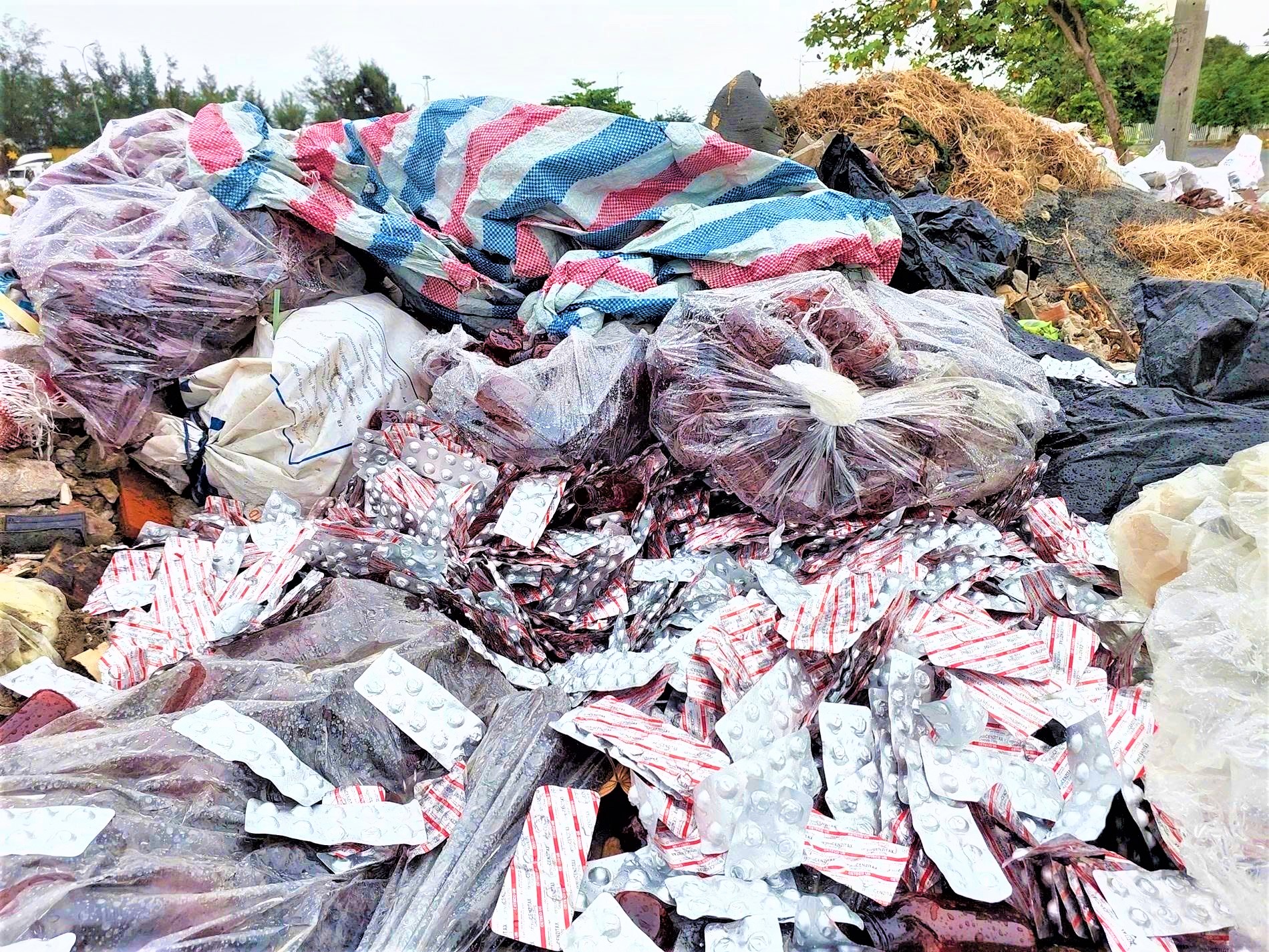 Lực lượng chức năng đã kiểm tra hiện trường, thu gom và cân trọng lượng số rác thải, xác định tổng cộng 98,4 kg, gồm 11 túi ni lông màu đen. Trong đó, 9 túi chứa lọ đựng thuốc rỗng và 2 túi chứa các vỉ thuốc Ceteco Cenzitax Cinarizin 25mg.