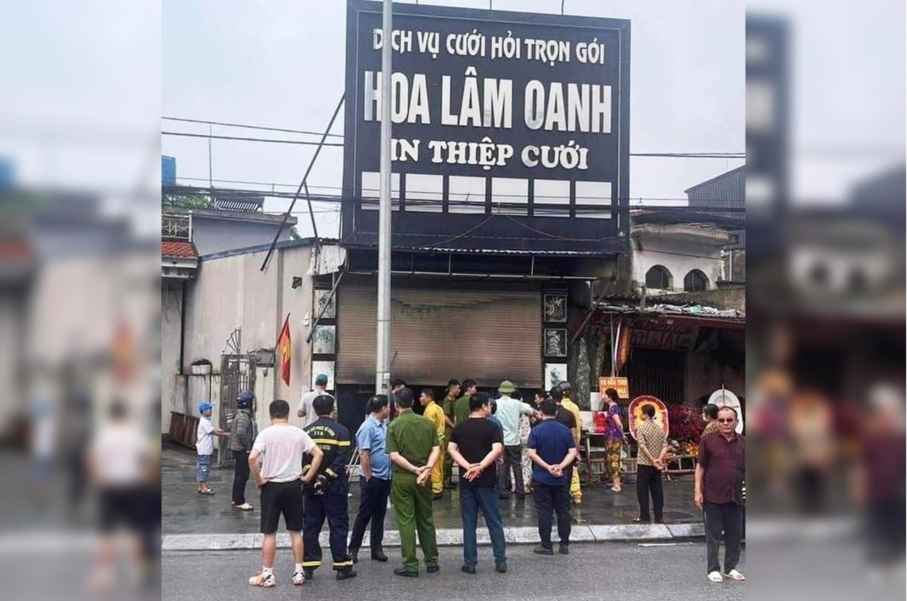 Căn nhà với mặt tiền bán hoa, dịch vụ cưới hỏi bốc cháy trong đêm. Hệ thống điện trong nhà tự ngắt khiến cửa cuốn đóng chặt.