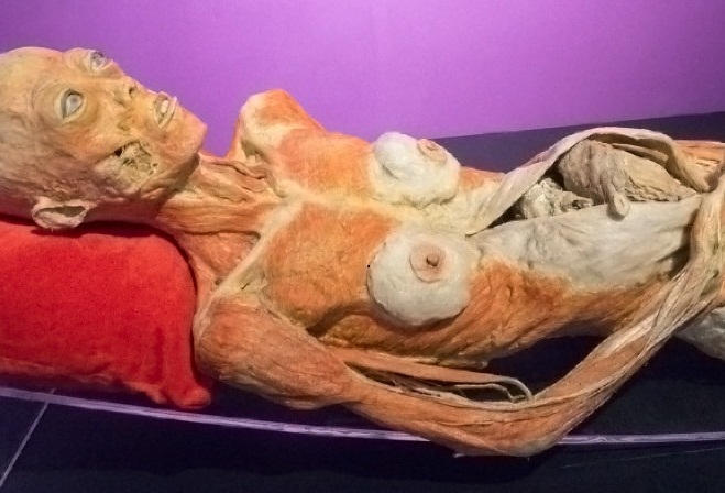 Các hiện vật đều được người thuyết minh khẳng định là thi thể người thật đã được ngâm trong dung dịch nhựa (nhựa hóa thi thể).