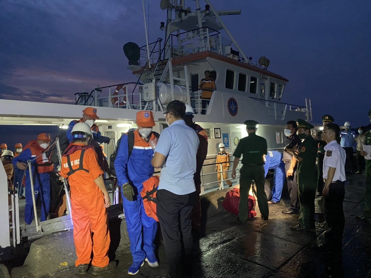 Các thuyền viên người Việt và người Trung được lực lượng cứu hộ đưa lên bờ an toàn, chiều 26/9. (Ảnh: baothuathienhue.vn)