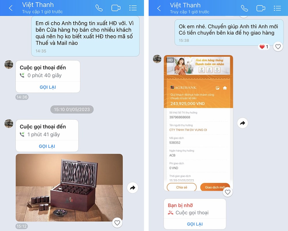 Người khách tên Thanh này phản hồi là có quen cơ sở cung cấp loại rượu nói trên và gửi số điện thoại zalo có tên “Cửa hàng xuất nhập khẩu” để nhà hàng tự đặt mua. Đồng thời, người khách này còn nhờ mua sâm để làm quà tặng cho cấp trên và xin số tài khoản nhà hàng.