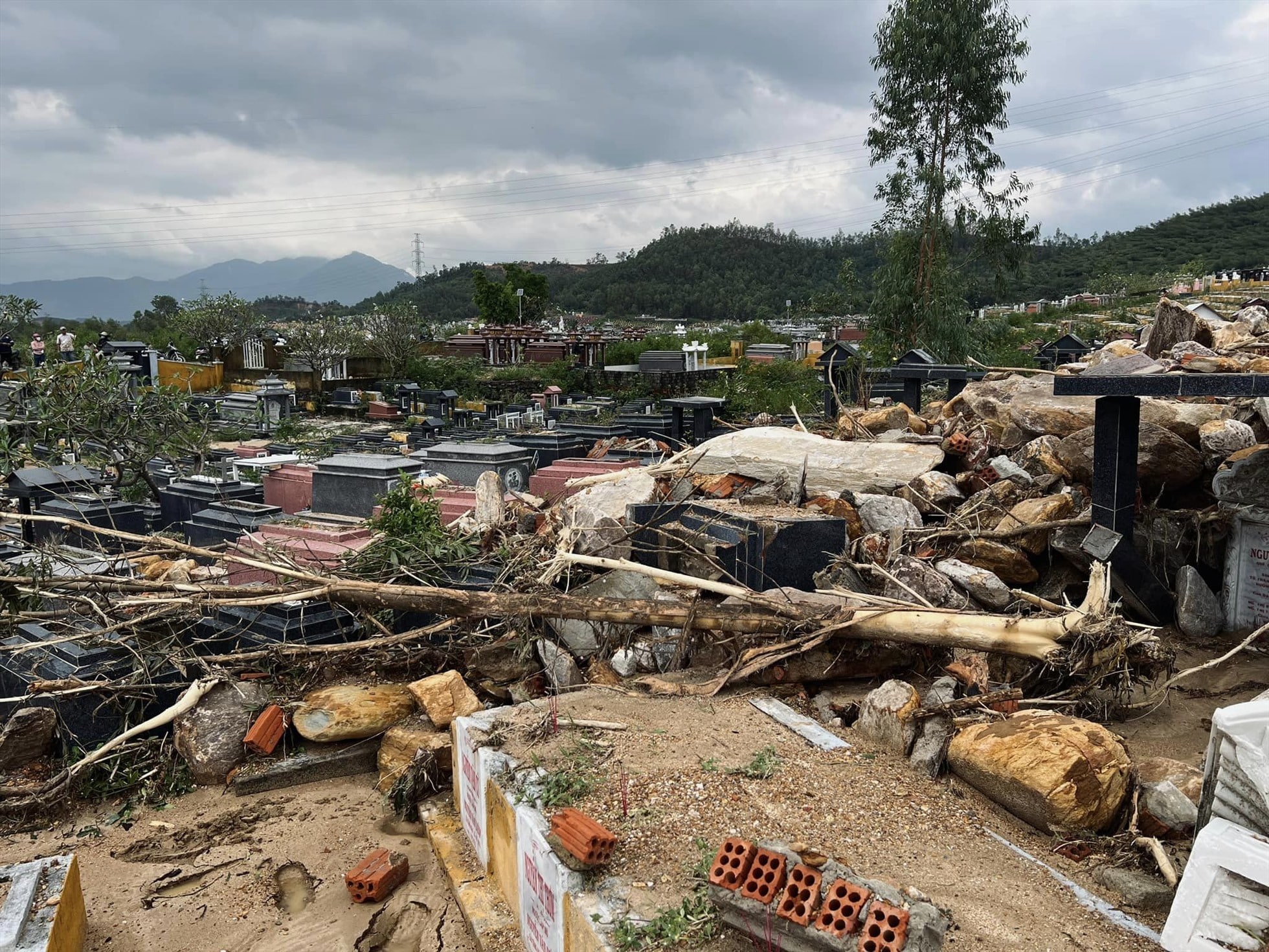 Sáng 16/10, ghi nhận tại nghĩa trang, có ít nhất 3 điểm ở bị sạt lở. Hàng ngàn ngôi mộ tại đây bị đất đá tràn xuống cuốn trôi, vùi lấp. Hệ thống tường rào bao quanh nghĩa trang cũng bị mưa lũ làm bong tróc. Cây cối, đất đá… nằm ngổn ngang.