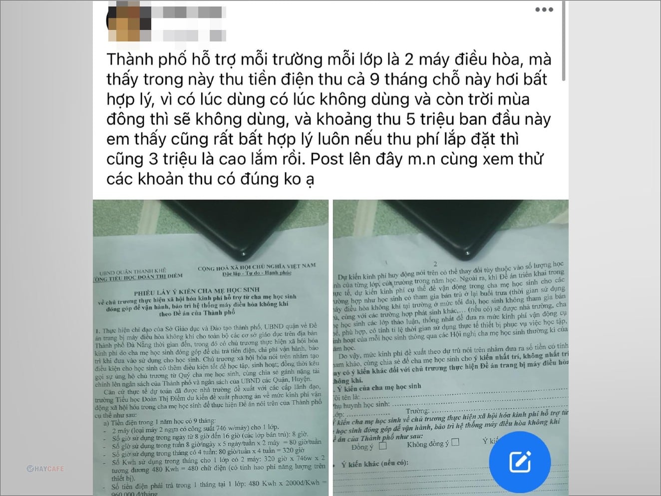 Trước đó, một phụ huynh của Trường Tiểu học Đoàn Thị Điểm (quận Thanh Khê, TP. Đà Nẵng) đăng lên mạng xã hội hình ảnh biên bản lấy ý kiến phụ huynh về việc thu tiền để vận hành, bảo trì hệ thống máy điều hoà theo đề án của thành phố.
