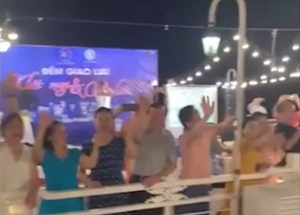 Hai du thuyền 5 sao cập mạn, biến sân thượng thành một sảnh tiệc lớn trên biển trong tiếng hò reo của những người tham dự tiệc. (Nguồn: Người dân ghi lại/tienphong.vn)